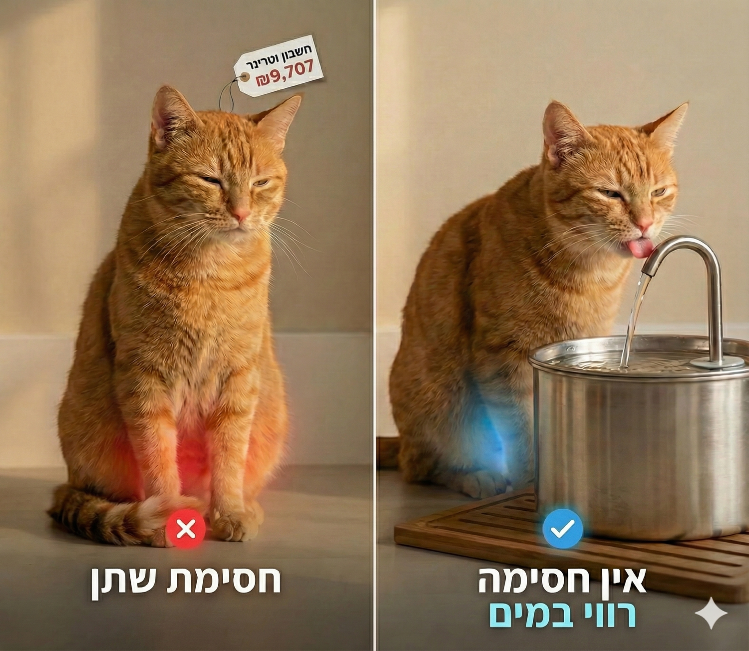 מים מזוהמים החתול מפסיק לשתות התייבשות שתן מרוכז פגיעה חמורה בכליות הצטברות גבישים חסימות כואבות חשבון וטרינר חירום של 9,000₪+