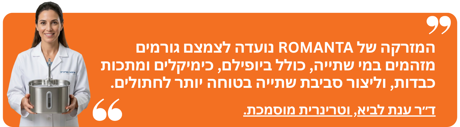 • "החתולים שלי כמעט לא שתו מים, והווטרינר כבר התחיל להזהיר. עברתי גם למזרקה רגילה, הם שתו יותר — אבל הבדיקות רק החמירו. מאז שעברתי ל-ROMANTA המצב השתנה, הם שותים רגיל והבדיקות השתפרו.